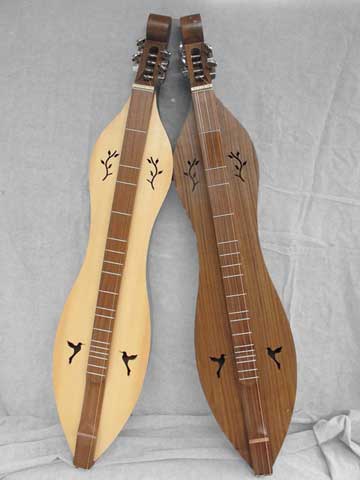 DU-46-S Hummingbird Mountain Dulcimer package. Hourglass shape 34 1/2" long, 7 1/2" wide. 1 3/4" soundbox. Hummingbird soundholes lower bout and vines on upper bout. Wolf soundhole dulcimer coming soon. Solid Walnut scroll head and fretboard, sides and back. Spruce or walnut top. 6 1/2 and 12 1/2 fret included. 25 1/2" fret scale length. 4 string with double melody and equidistant spacing option. Available as instrument only or as a package that includes noter, pick, TK O'Brien's Guide to Playing the Mountain Dulcimer, padded heavy duty nylon carrying case. |